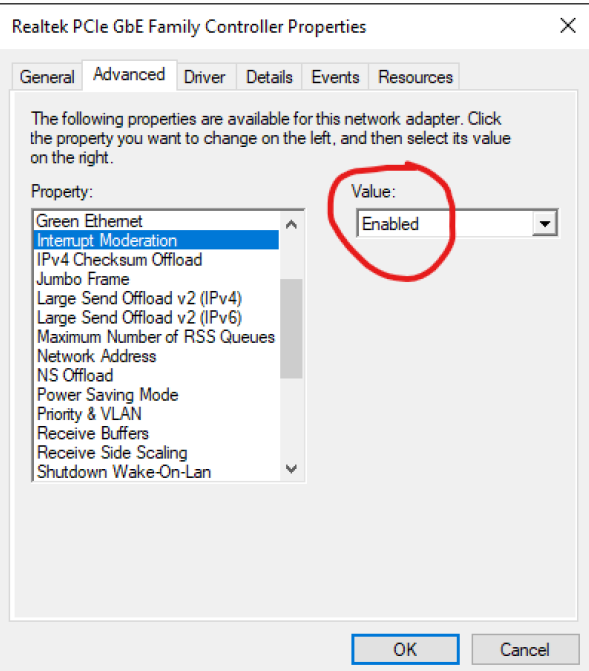 Click to highlight the property Interrupt Moderation Rate and set its Value to Adaptive.