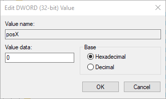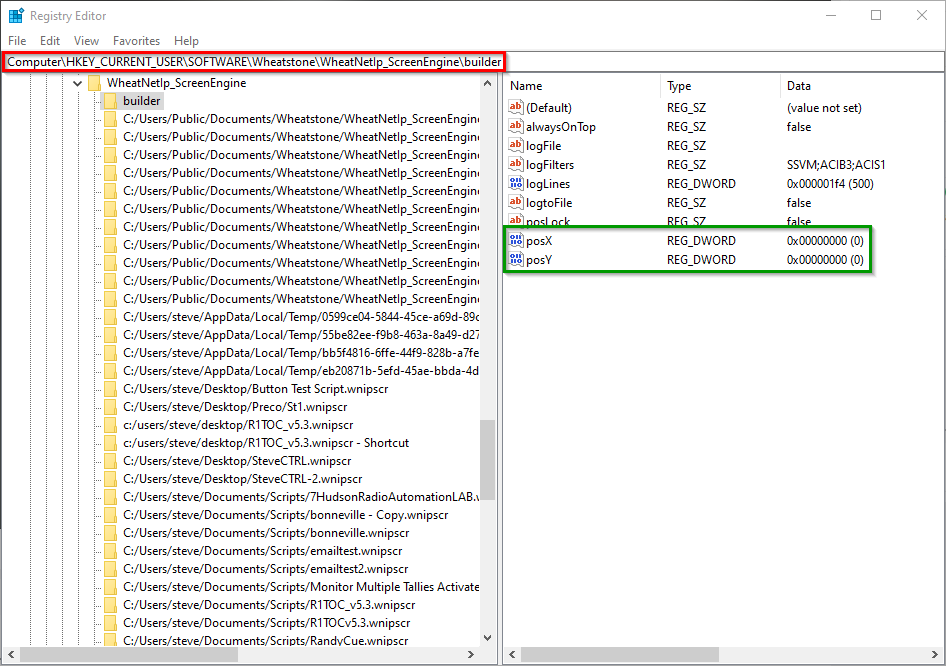 Navigate to the registry key you see outlined in red above. Look to the right-hand side of the screen for the posX and posY values, outlined in green in the screenshot. These are the x-y coordinates on the screen, where the top left corner of the screen will be when you start the program.
